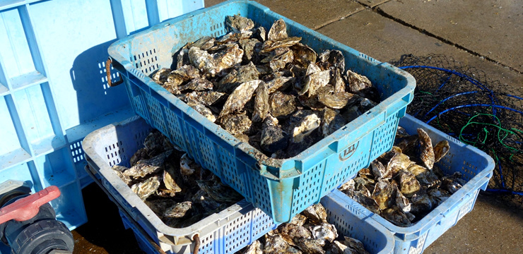 この輸出事業は、むき身生産が終盤を迎える2月から抱卵前の6月にかけた、最も味が濃く、身入りの良い殻付き牡蠣を集荷する。国内の需要期にむき身加工が間に合わず、海につるしたまま越年する牡蠣が多いことに注目し、これらの牡蠣を各工場で洗浄、重量選別を行い、協力工場で凍結、箱詰めを行い、海外へ輸出を行います。